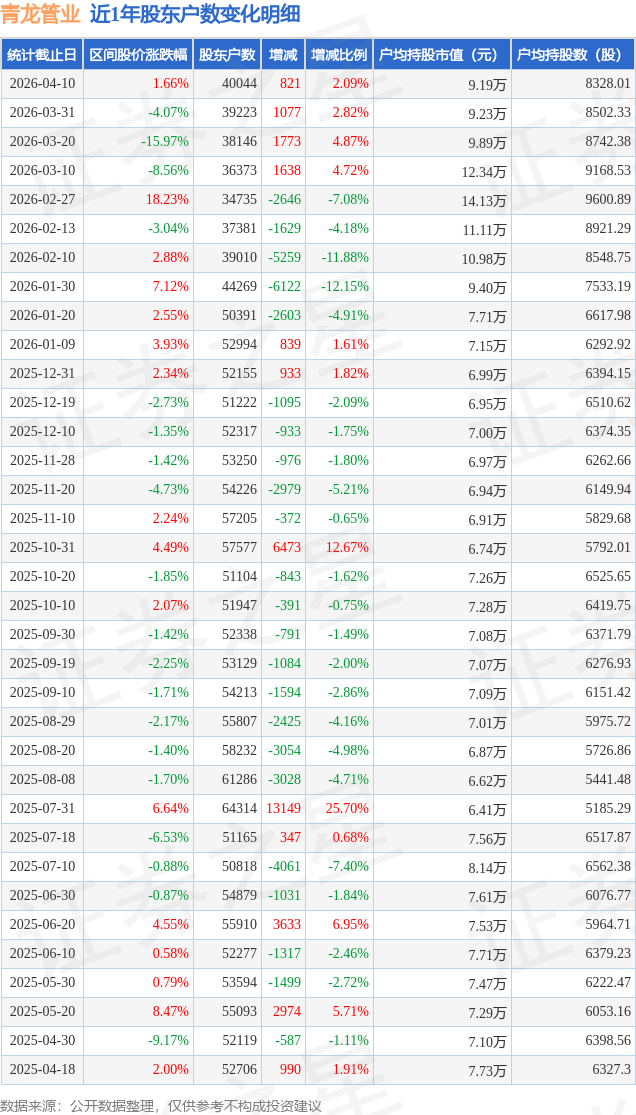 近日青龙管业披露,从股价来看,2026年3月31日至2026年4月10日,增幅为2.09%。青龙管业2026年3月31日至2026年4月10日,
